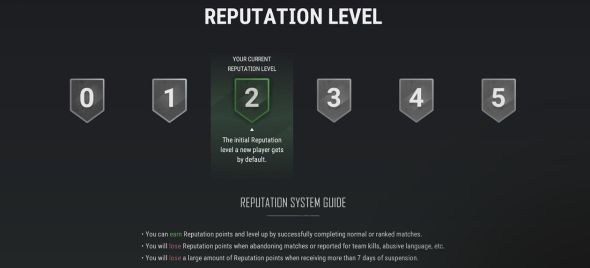 - Meldungen zu negativem Verhalten (das Behindern des Gameplays, verbale Ausfälle, Team-Kills usw.) können zu einer Verringerung des Ruf-Levels führen.