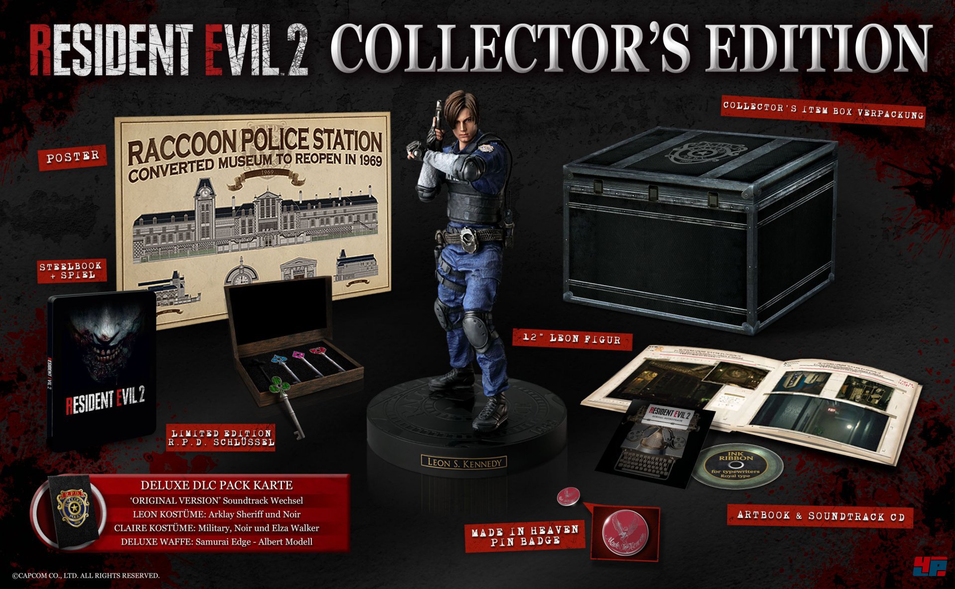 Darüber hinaus wird in Deutschland, Österreich und der Schweiz am 25. Januar 2019 zusammen mit der Standard Edition auch eine physische Collector’s Edition erscheinen. Ein Preis wurde nicht genannt. Die limitierte Resident Evil 2 Collector’s Edition umfasst: