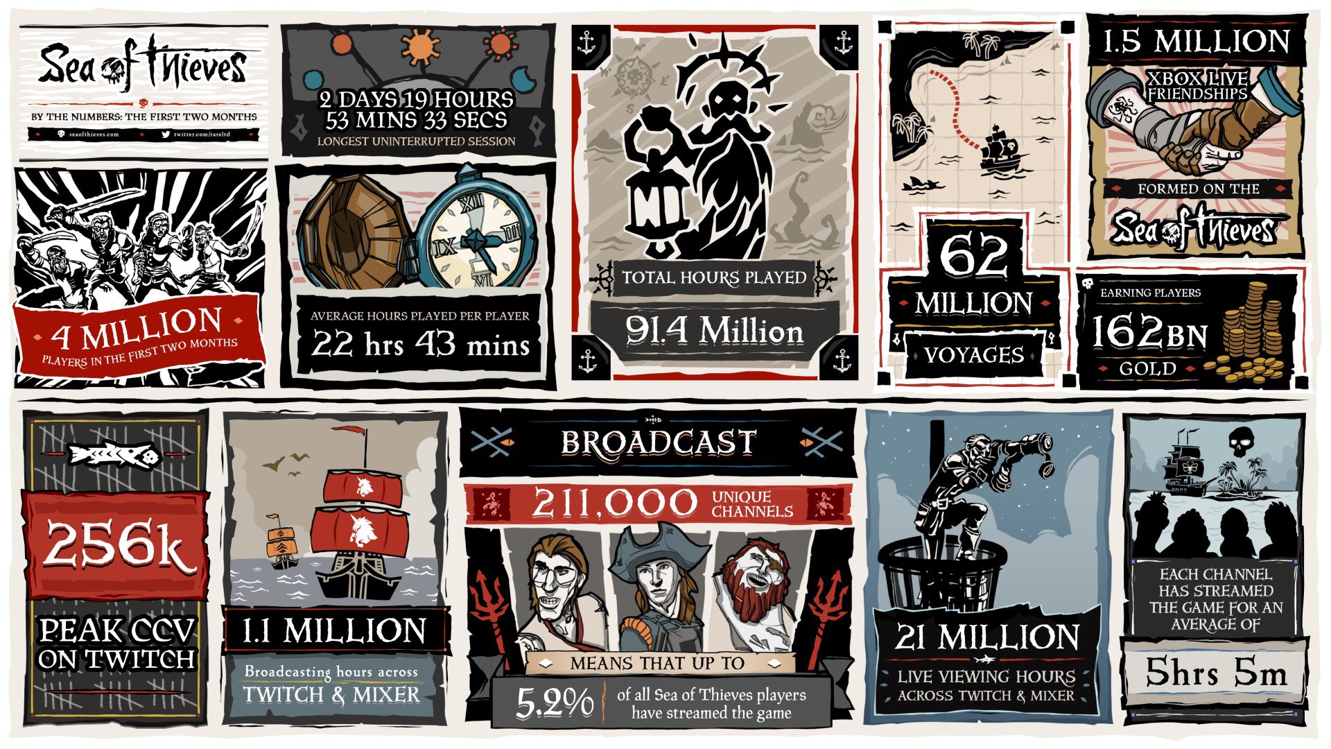 In den ersten zwei Monaten nach dem Stapellauf von Sea of Thieves am 20. März 2018 auf PC und Xbox One konnte das Freibeuter-Abenteuer (zum Test) mehr als vier Millionen Spieler verzeichnen, wie Rare und Microsoft anhand folgender Infografik bekannt geben: