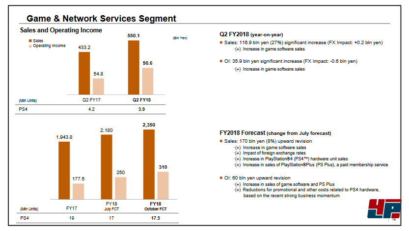 Der Umsatzausblick für das Geschäftsjahr in dem Gaming-Breich wurde ebenfalls um acht Prozent angehoben – von 2,18 Billionen Yen (ca. 16,52 Mrd. Euro) auf 2,35 Billionen Yen (ca. 18,36 Mrd. Euro). Auch der Gewinn soll steigen (von 250 Mrd. Yen (ca. 1,89 Mrd. Euro) auf 310 Mrd. Yen (ca. 2,35 Mrd. Euro)). Als Gründe werden stärkere Hardware- und Software-Verkäufe, mehr PS-Plus-Mitglieder, positive Währungseffekte und weniger Kosten für Promo-Aktivitäten genannt.