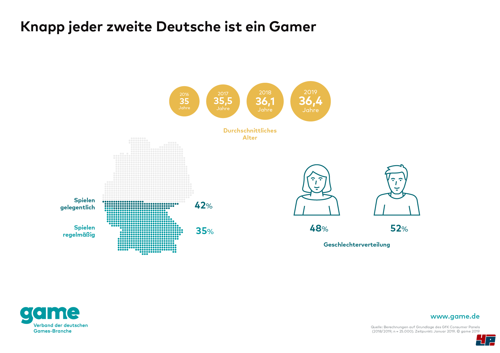 Im Rahmen einer Pressekonferenz zum Start der gamesweekberlin gab der Verband bekannt: „Ein wichtiger Grund für diese Entwicklung: Der Anteil der Gamer, die 50 Jahre und älter sind, steigt kontinuierlich an. 2019 spielen fast 10 Millionen Menschen über 50 Jahren Computer- und Videospiele. Damit beträgt ihr Anteil an allen Spielerinnen und Spielern mittlerweile 29 Prozent. Insgesamt spielen über 34 Millionen Menschen in Deutschland Games auf Smartphones und Tablets, dem PC sowie Spielekonsolen und Handhelds. Mit 48 Prozent stellen Frauen die Hälfte der Spielenden.“ „Die vielen Veränderungen, die das Medium Games in den vergangenen Jahren durchlaufen hat, werden nirgends so deutlich wie beim ansteigenden Durchschnittsalter. Games sind auch heute noch ein Jugendmedium; sie sind darüber hinaus aber auch vieles mehr geworden: Kultur- und Lehrmedium, Innovationstreiber und Therapiemittel sowie Sport“, sagt game-Geschäftsführer Felix Falk. „Diese Vielfältigkeit zeigt auch die gamesweekberlin auf: Hier werden Games als Kulturmedium ebenso gezeigt, wie über sie als Sport diskutiert und als Innovationstreiber referiert wird.“