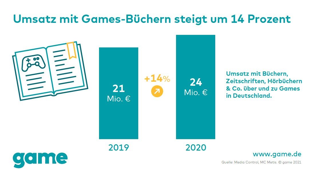 In Deutschland wurden mit dem Verkauf von Büchern, Zeitschriften oder Hörbüchern über und zu „Games“ rund 24 Millionen Euro im Jahr 2020 umgesetzt. Das ist ein Anstieg um 14 Prozent verglichen mit 2019 – laut dem game – Verband der deutschen Games-Branche auf Basis von Daten des Marktforschungsunternehmens Media Control.