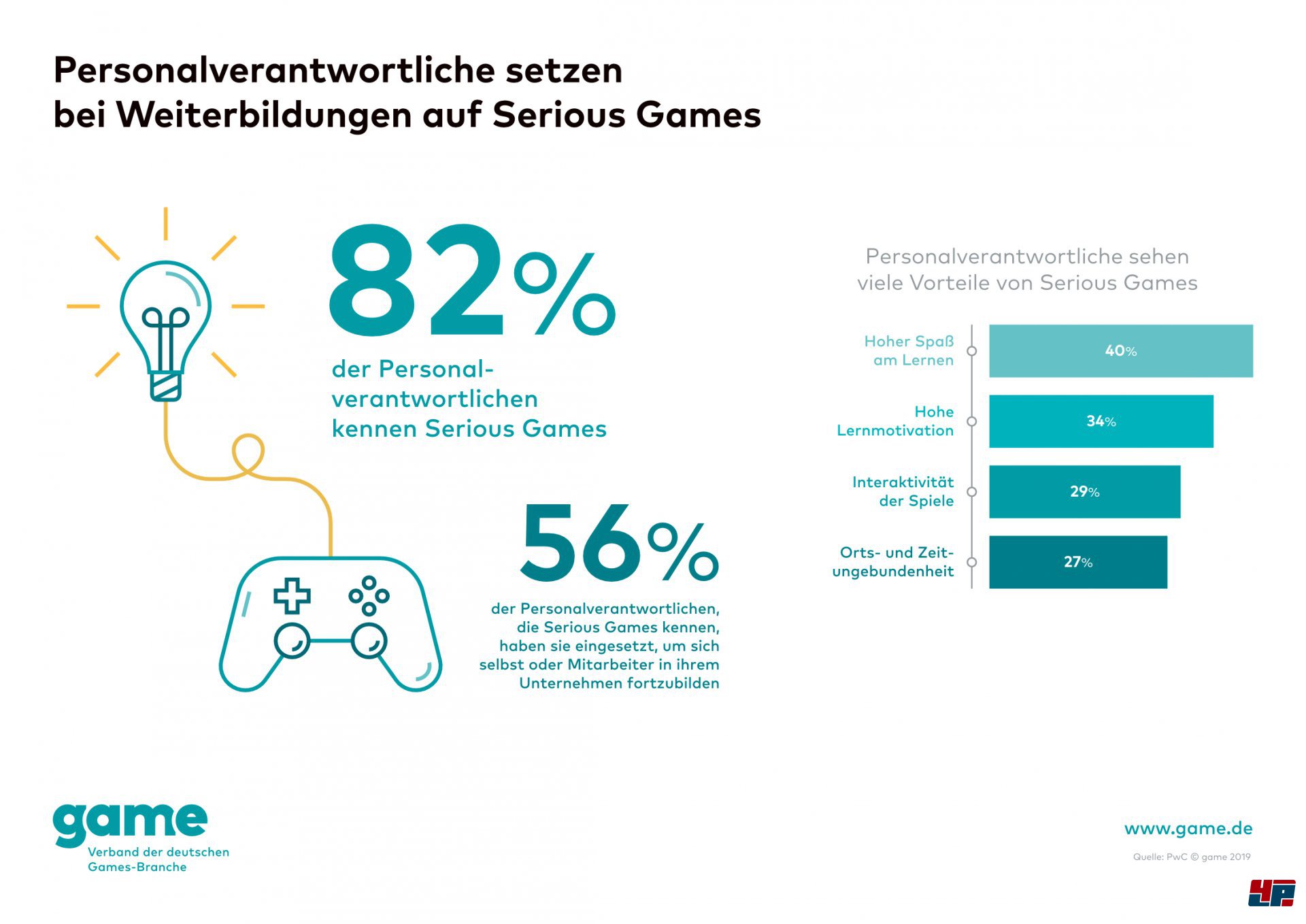 game, der Verband der deutschen Games-Branche e.V., meldet auf Basis einer Befragung der Wirtschaftsprüfungs- und Beratungsgesellschaft PricewaterhouseCoopers (PwC), dass viele Personalverantwortliche großes Interesse an Computerspielen zur Wissensvermittlung bei der beruflichen Weiterbildung haben. Danach gaben 82 Prozent der befragten Personalverantwortlichen an, bereits von Serious Games gehört zu haben. Die Hälfte von ihnen (56 Prozent) will bereits entsprechende Lernspiele eingesetzt haben, um sich selbst oder Mitarbeiter in ihrem Unternehmen fortzubilden. Die Anwendungsbereiche reichen dabei von der Vermittlung von Fachwissen oder dem Erlernen neuer Sprachen über die Verbesserung kognitiver Fähigkeiten wie der Merkfähigkeit bis hin zu Softskills (Konfliktfähigkeit).