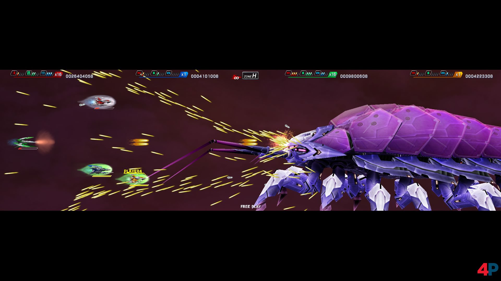 „WARNING! A huge battleship is approaching fast.“ Die Bossgegner-Warnung von Taitos Darius-Serie ist ebenso legendär wie das Design seiner Obermotze. Anders als z.B. in Gradius oder R-Type waren das nämlich nicht riesige Raumschiffe oder Aliens, sondern tödliche Meereskreaturen – von Feuerfisch bis Nautilus. Dariusburst Chronicle Saviours, der aktuellste Vertreter der Reihe, ist wegen seines extremen Breitbild-Formats und des lokalen Vierspieler-Koopmodus ein ausgefallenes Ballerspiel. Mit einer bewegten Geschichte: Dariusburst (ohne den Namenszusatz) erschien nämlich 2009 zunächst für die olle PSP, wurde dann kräftig aufgemotzt in die Spielhalle geschickt – von da ging es 2015 schließlich zurück auf Sony-Konsolen sowie den PC. In spielerischer Hinsicht motivieren die vielen harten Missionen, freispielbaren Waffen und der gesalzene Schwierigkeitsgrad – wie man mit seiner abkoppelbaren Lasereinheit richtig umgeht, will gelernt sein.