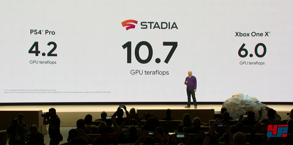 Phil Harrison, früher bei Sony (PlayStation) und Microsoft (Xbox), nun bei Google, hob hervor, dass eine Stadia-Instanz (auf der ein Spiel für einen Spieler läuft) eine Rechenleistung von 10,7 GPU Teraflops hätte (PS4 Pro: 4,2 Teraflops; Xbox One X: 6,0 Teraflops), und zwar beim Single-GPU-Betrieb. Game-Streaming in 4K mit 60 fps in HDR soll ebenfalls möglich sein – als Beispiel wurde Doom Eternal von id Software und Bethesda genannt. „Später“ sollen sogar 8k mit 120 fps möglich sein. Harrison erklärte außerdem, dass die Spieler innerhalb von Sekunden auf die Spiele zugreifen könnten und keine Updates, Installationen und Co. nötig seien. Sowohl die Unreal Engine als auch die Unity Engine sollen die Streaming-Plattform bereits unterstützen.