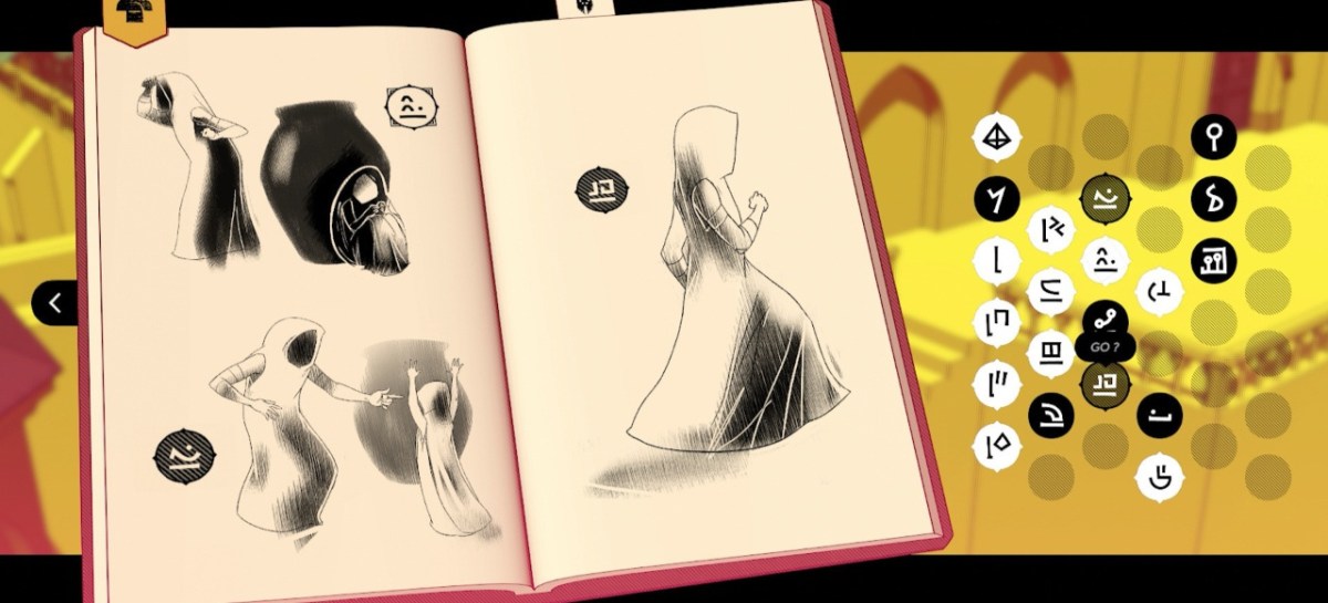 Das Tutorial wird mit zum Glück in verständlicher Sprache angezeigt. Es erklärt mir, wie ich mich bewege, interagiere und für die Zeichen, die wie Hieroglyphen aussehen, meinen Vorschlag eingeben kann. Zunächst stellt mich das Spiel vor eine Tür mit einem Hebel. Nach oben und unten zeigend steht jeweils ein Zeichen. Drei kann ich nun in meinem schlauen Buch übersetzen: Öffnen, schließen und Tür.