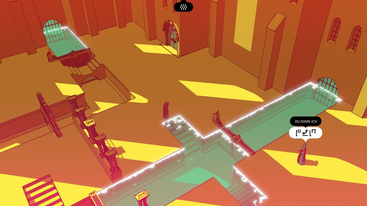 Ob das stimmt, weiß ich zunächst nicht. Im nächsten Raum bin ich mir dann aber sicher: Ich muss ein Muster nachbilden, indem ich verschiedene Wasserfälle öffne und schließe. Die Zeichen zeigen an, welcher offen und welcher geschlossen sein muss. Dann öffnet sich erneut eine Tür. Ich treffe eine Person, erlerne einen Gruß sowie die Wörter „Du“ und „Ich“. Besagte Person und ich müssen immer abwechseln Hebel betätigen, die das Wasser von Treppen fernhalten. Dann kann der andere hindurchgehen und erneut den Hebel betätigen. Die Person sagt dabei immer wieder „Ich dann du“ oder „Du dann ich“.