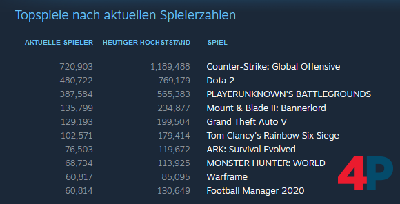 In den Topspielen nach aktuellen Spielerzahlen gibt es kaum Überraschungen. Neben Counter-Strike: Global Offensive (Free-to-play), Dota 2 (Free-to-play) und PlayerUnknown’s Battlegrounds erfreut sich Mount & Blade 2: Bannerlord trotz Early Access und vergleichsweise hohem Preis sehr großer Beliebtheit. Gefolgt von den Dauernbrennern Grand Theft Auto 5, Rainbow Six Siege, ARK: Survival Evolved, Monster Hunter: World, Warframe und Football Manager 2020 (aktuell Free-to-play-Event).