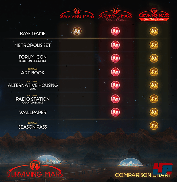 Die First Colony Edition bietet zusätzlich zu den Inhalten der Deluxe Edition noch den Season Pass. Der Season Pass wird zwei Erweiterungen und zwei Inhaltspakete umfassen – weitere Details wurden nicht erwähnt. Surviving Mars wird am 15. März 2018 erscheinen.