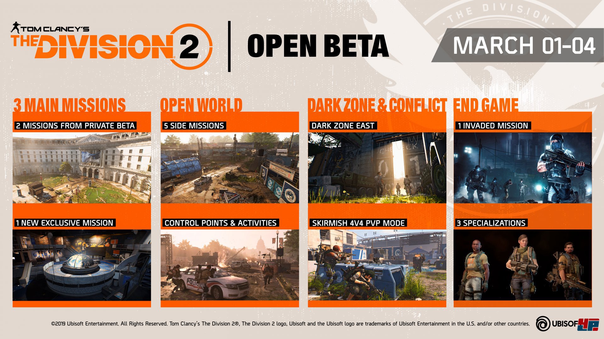 Die Open Beta umfasst drei Hauptmissionen, fünf Nebenmissionen, die aufwertbare Theatersiedlung, die „Dark Zone East“ und einen Einblick in die Endgame-Inhalte. Die „Private Beta“ umfasst zum Vergleich zwei Hauptmissionen. Die finale Version von The Division 2 erscheint dann am 15. März 2019.