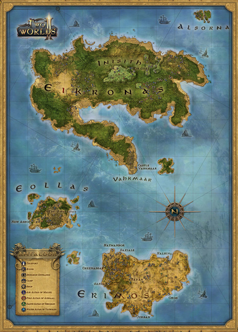 Diejenigen, die sich schon vor dem Start des Rollenspiels Two Worlds II, über die Fantasy-Welt „Antaloor“ informieren wollen, können sich jetzt die offizielle Karte runterladen, auf der einige Details der Hauptinseln Alsorna, Elkronas, Eollas und Erimos zu entdecken sind. Übrigens erleichtern Segelboote (die vom Spieler selbst gesteuert werden können) und Teleportstationen das schnelle Reisen zwischen den unterschiedlichen Regionen – Wüste, Savanne, Dschungel oder den mysteriösen Swallows. Zusätzlich gibt es auf der offiziellen Website noch eine interaktive Karte mit Screenshots.