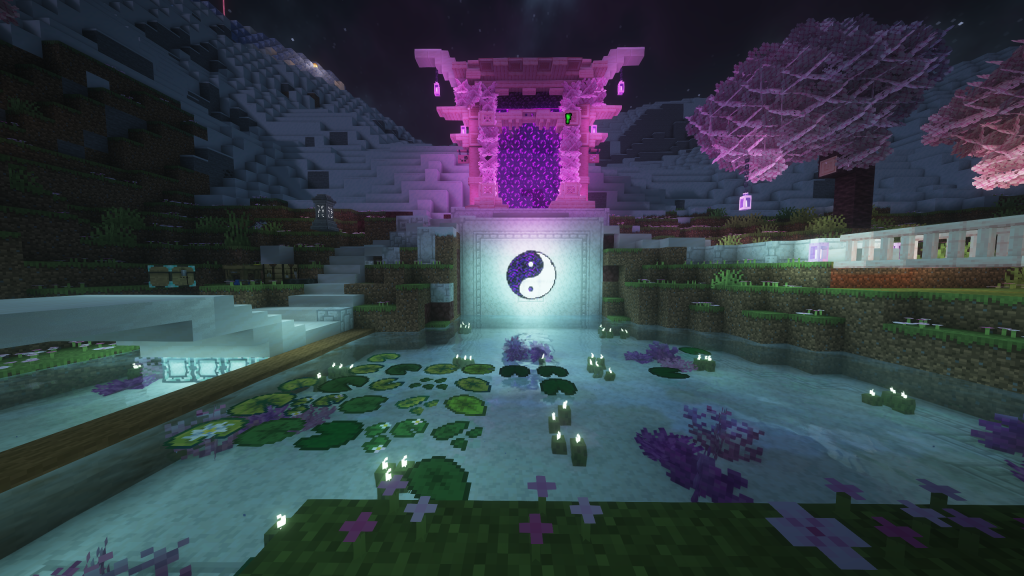 Nun versinke ich in einem Meer aus spärlich beleuchteten Kirschblütenbäumen und werkele unbeirrt am riesigen Zierteich am Fuße einer verschneiten Berglandschaft, während ich mit Käfigen für die hauseigene Menagerie aus plappernden Papageien und putzigen Pandabären nur so um mich schmeiße. Ganz so, wie ich mir mein magisches Minecraft-Märchen eben immer vorgestellt habe.