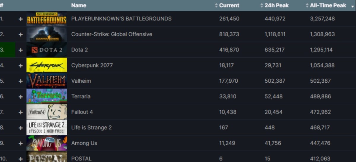 Die Marke von 500.000 Spielern gleichzeitig sei bisher nur von vier anderen Titeln übertroffen worden, und zwar von PlayerUnknown’s Battlegrounds (mit üppigen 3,2 Mio.), Counter-Strike: Global Offensive, Dota 2 und Cyberpunk 2077. Somit habe man in diesem Bereich Terraria, Fallout 4 und Among Us geschlagen (wobei Among Us zusätzlich auf Mobilsystemen sehr beliebt gewesen sei; mit einem Rekord von 1,5 Mio. Spielern gleichzeitig auf verschiedenen Plattformen).
