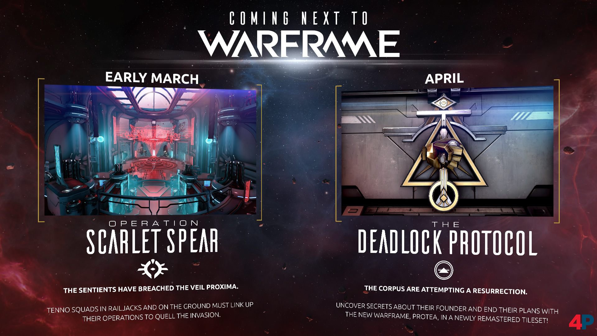 Anfang März erscheint mit Operation Scarlet Spear die erste große Inhaltserweiterung für Warframe in diesem Jahr. In Operation Scarlet Spear dringen die Sentients mit neuen Streitkräften in Veil Proxima ein – inkl. Story-Fortführung und neuer Zwischensequenz. Die Tenno (Spieler in Warframe) müssen in Railjacks und am Boden gemeinsam gegen diese Invasion kämpfen, vorher war dieses Konzept als „Squak Link“ bekannt, nun heißt es „Operation Link“. Zugleich plant Digital Extremes größere Anpassungen, Bugfixes und Überarbeitungen, die sehr ausführlich im Forum aufgelistet werden (zum Beitrag). Viele Aspekte wurden auch im Devstream #139 angesprochen.
