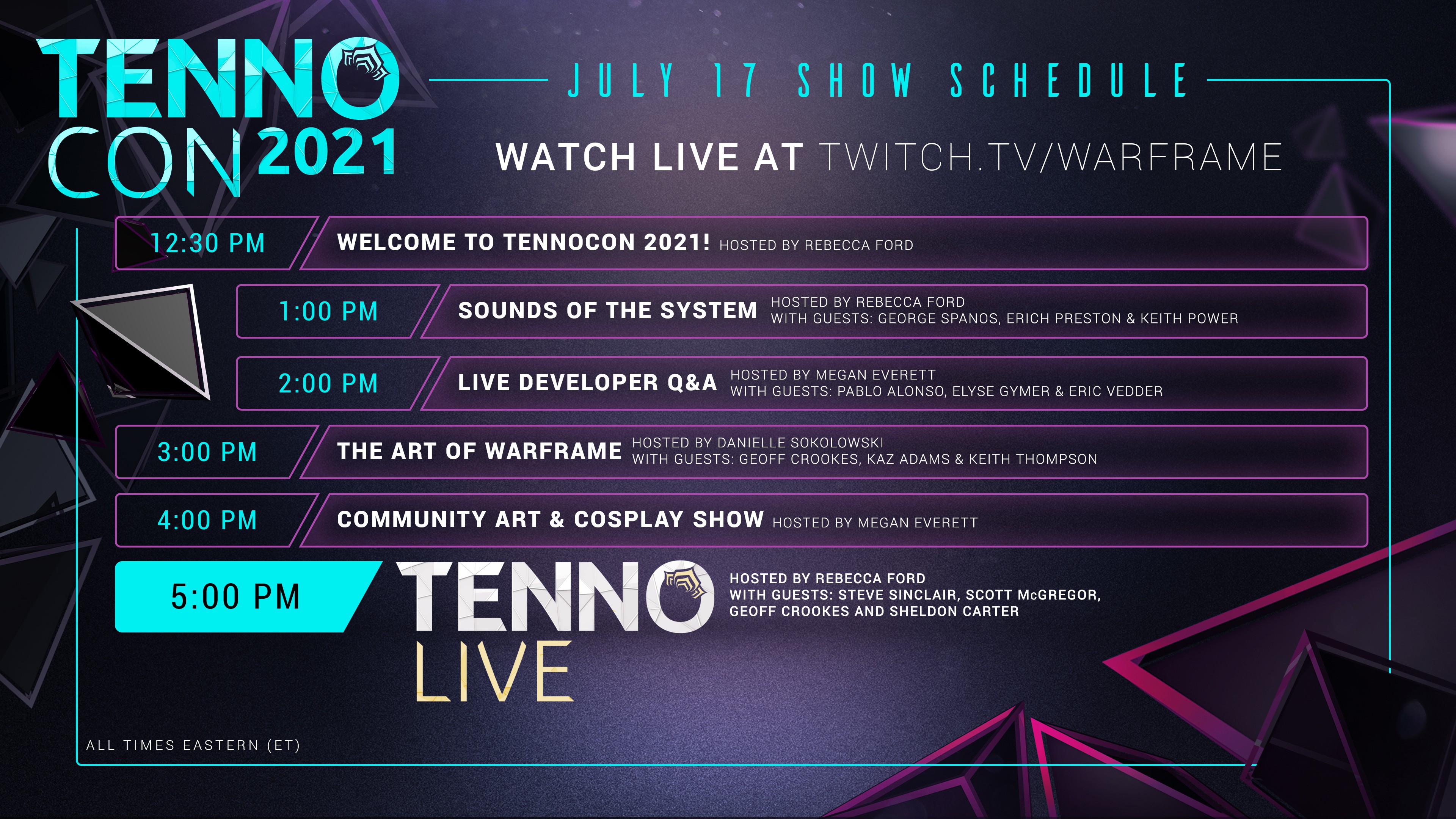 Die TennoCon 2021 als digitale Warframe-Hausmesse von Digital Extremes ist für den 17. Juli (Samstag) angesetzt. Die Entwickler wollen über die zukünftigen Inhalte sprechen, viele Einblicke hinter die Kulissen geben und ebenfalls Community-Aktionen veranstalten (z.B. Community-Art-Show und Cosplay-Wettbewerb). Es folgt der aktuell geplante Event-Zeitplan, wobei die Hauptshow „TennoLive“ rund um die Warframe-Zukunft um 23 Uhr beginnen wird.