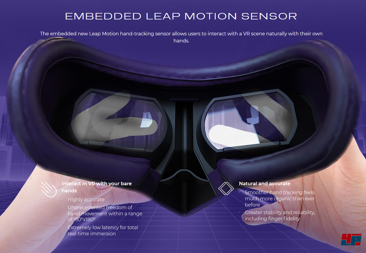 Das Sichtfeld der XTAL liegt laut Hersteller bei 180 Grad, das Design berücksichtige ein wenig Extraraum für Brillenträger. Der Abstand zwischen den Pupillen (IPD) wird hier automatisch erkannt und eingestellt – ein Vorteil bei häufigem Wechsel zwischen unterschiedlichen Nutzern. Neben Vive-Controllern lassen sich auch bereits die neuen Index-Controller von Valves Headset einsetzen. Zusätzlich zum unterstützten Lighthouse-Tracking ist ein Leap-Motion-Sensor für Handtracking integriert: