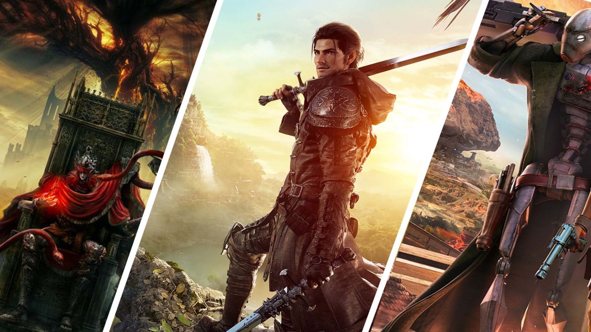 Von Elden Ring über ein Fantasy-MMO bis hin zum Sternenkrieg: Von Sommerloch kann 2024 kaum zu reden sein. Credit: Bandai Namco / FromSoftware / Square Enix / Ubisoft / bearbeitet mit Adobe Photoshop