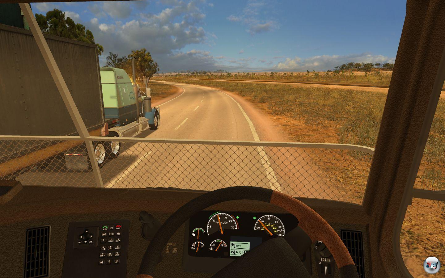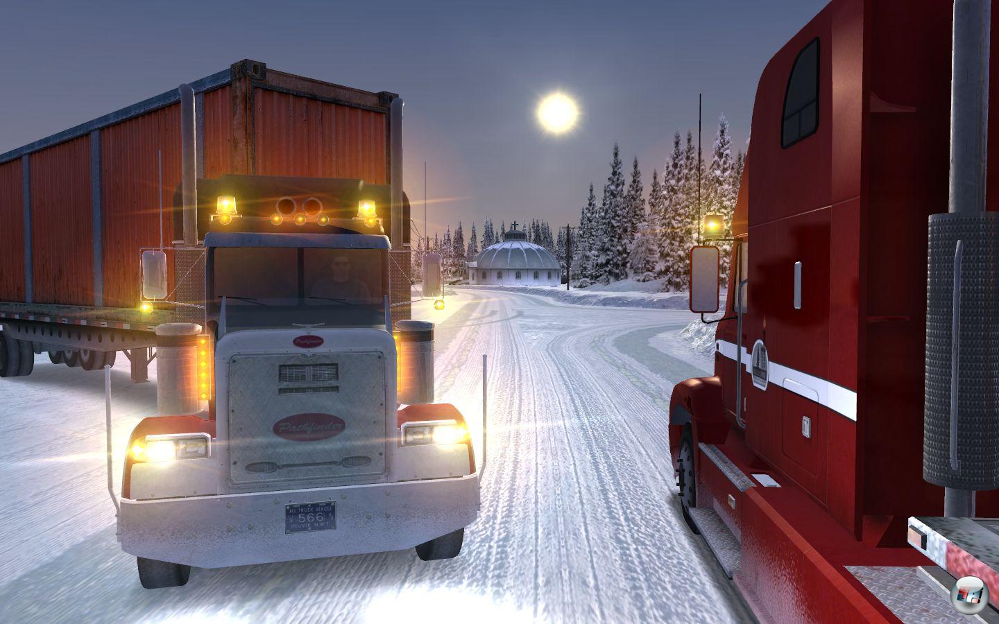 Von 1977 bis 1996 wurden sechs Staffeln der Trucker-Serie mit Manfred Krug in der Hauptrolle abgedreht. Ein wichtiger Grund für den Erfolg, war sicher auch die Tatsache, dass an exotischen Orten gefilmt wurde. Da musste Krug (alias Meerdonk) seinen Sattelschlepper mal über die marokkanische Steppe, mal durch thailändische Dschungelstraßen manövrieren – die weite Welt, Abenteuer trifft Fernweh, ein Rezept das aufging. Warum nicht auch bei einem Trucker-Spiel, dachte man sich bei Rondomedia. Und so geht’s beim neuesten Ableger der 18 Wheels of Steel – Serie in „extreme“ Gebiete. Genauer: Nach Alaska, Australien und in die Anden. Das Abenteuer beginnt im Norden. Wer unlängst mal bei DMAX reingeschaut hat, könnte es wissen: In Kanada und Alaska fahren mitunter tatsächlich tonnenschwere Sattelschlepper über meterdickes Eis, in der Doku-Soap „Ice road Truckers“ wird dies thematisiert. Na denn, das Abenteuer will ich mir nicht entgehen lassen und so stöpsle ich mein Force-Feedback-Lenkrad an und schwinge mich virtuell auf den Bock eines klassischen „Peterbilt“, um „Sondermüll“ von den Fantasieorten Tuktoyaktuk nach Inuvik zu transportieren. Zur Wahl stehen mir zunächst nur zwei Aufträge. Und da es schließlich Punkte zu sammeln gilt, um den Einstiegsrang „Autobahnmade“ möglichst schnell hinter sich zu lassen, entscheide ich mich für den mit der längsten Strecke, denn das bringt auch die meisten Punkte. Ein paar simple Symbole verraten mir, womit ich es zu tun bekomme: Informationen zu Wetter, Ladung, Strecke und Tageszeit lassen sich auf diese Weise schnell abrufen. Nachdem ich zwischen manueller oder automatischer Schaltung ausgewählt habe, gehts los. Nach kurzer Ladezeit finde ich mich am Steuer der Sattelzugmaschine wieder&.der Hänger ist netterweise schon angekoppelt, es kann also gleich losgehen. Gas geben und mit einem eher dünnen „Wrrumm“ setzt sich das Ungetüm in Bewegung.Durch Schnee und Eis