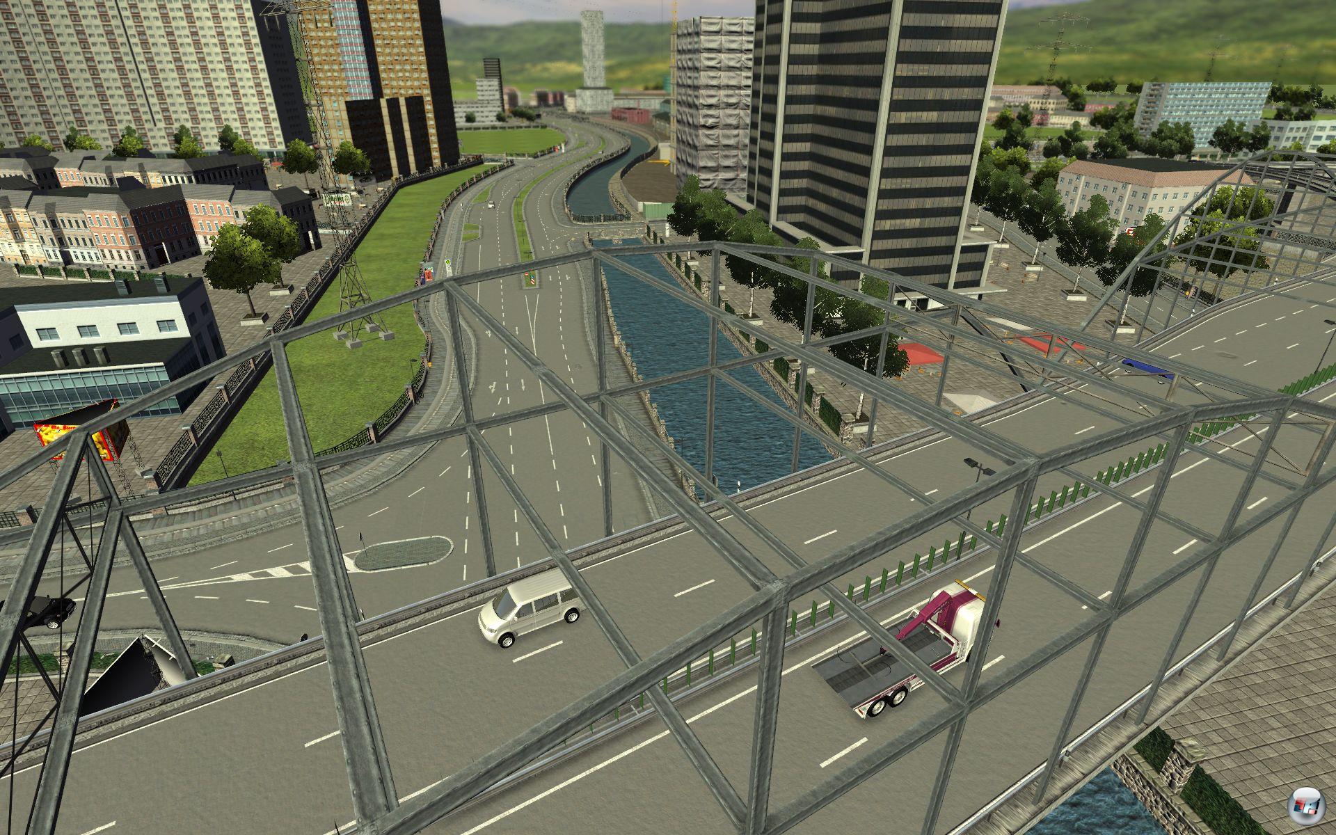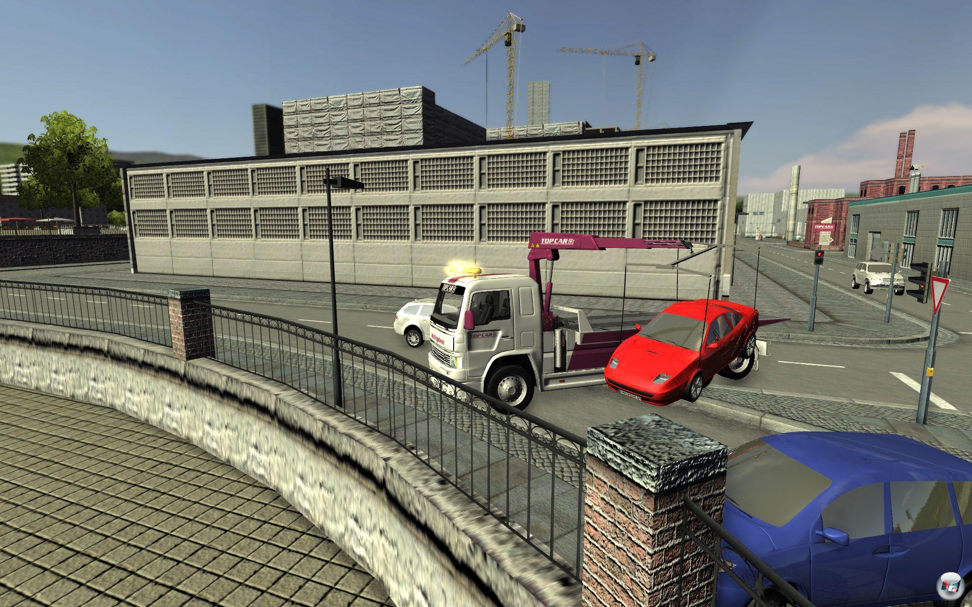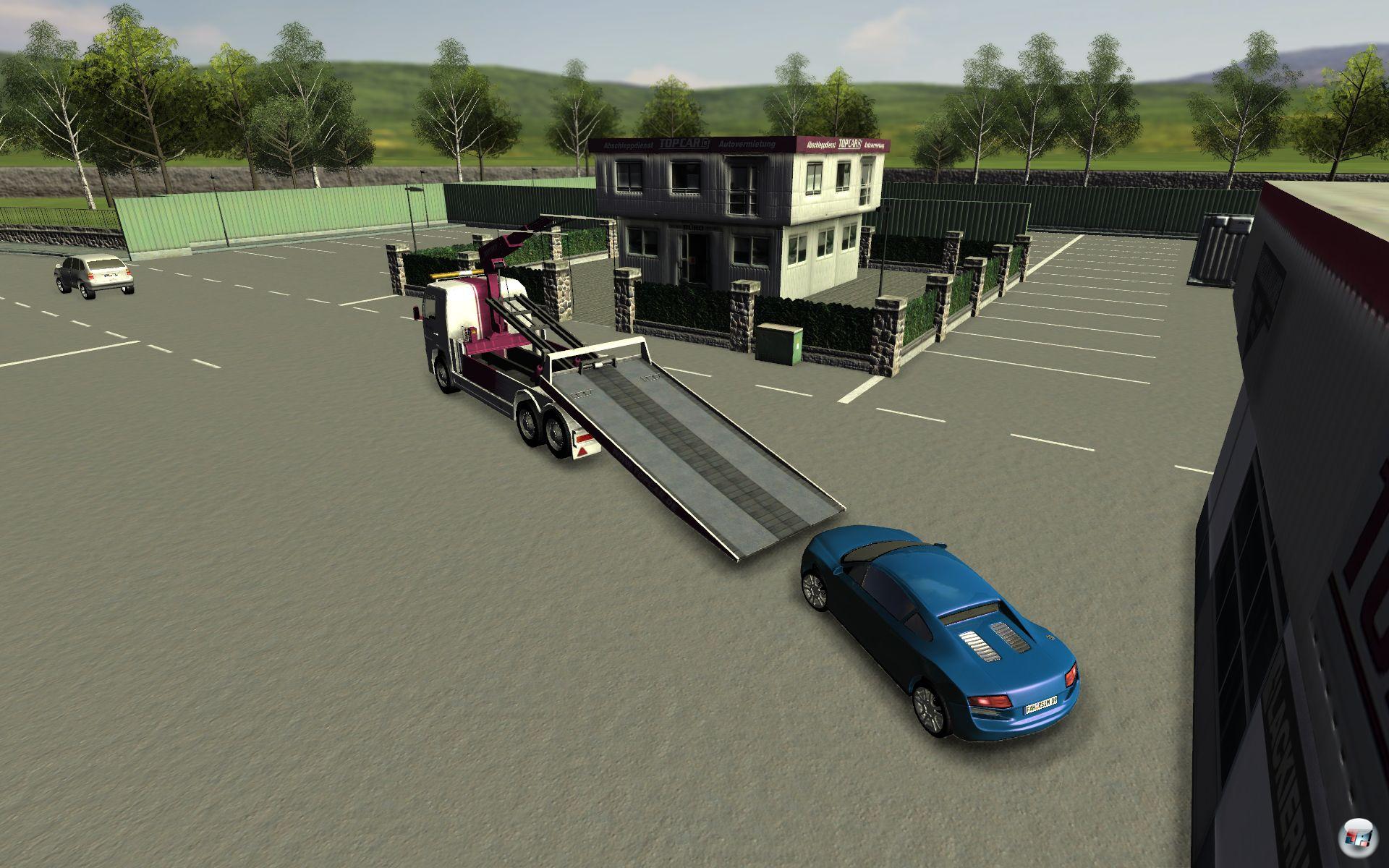 Nachdem ich das Spiel nicht zur Kooperation mit meinem Logitech-Lenkrad bewegen konnte, schließe ich ein Pad an und schiebe alles was grafisch möglich ist auf Maximum und starte meine „Karriere“. Nach ungewöhnlich langer Ladezeit lande ich am Steuer meines Abschleppwagens auf dem Hof meiner Firma „Top-Car“. Weder kann ich „meiner“ Firma einen eignen Namen geben – noch erfahre ich irgendwas über mein Alter Ego – man sieht ihn noch nicht mal, sogar aus der externen Kameraperspektive bleibt das Führerhaus leer. Immerhin: Ich darf zwischen drei Farbtypen des Interieurs wählen und zwei Felgentypen – hurra! Nun denn, man hat sich hier wohl, wie so häufig bei Spielen dieser Art, auf das Wesentliche zu beschränken: Den Job. Und da poppt am oberen Bildschirmrand auch schon der erste Auftrag auf: Es gilt einen Falschparker abzuschleppen und das lasse ich mir natürlich nicht zweimal sagen. Mit einem erschreckend dünnen „Surren“ setzt sich mein „MiM lkw L770I A“ (kein lizenziertes Fahrzeug) in Bewegung. Mir war bislang nicht bekannt, dass tonnenschwere Fahrzeuge auch per Elektromotor angetrieben werden können, aber man lernt wohl nie aus.