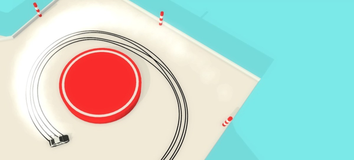 Die letzte Farbe, die exzessiv genutzt wird, ist Schwarz: Man hinterlässt überall, wo man fährt, driftet und die Karre ggf. ausbricht, Reifen-Spuren, die sich wie eine unbeholfene Kinderzeichnung über die gesamte Leinwand erstrecken, die man befährt. Leider ist die Länge des Gummiabriebs endlich und löst sich irgendwann wieder in Weiß auf. Es wird also nicht möglich sein, die in sechs Abschnitte unterteilte Welt dunkel zu färben. Doch die Kulisse sorgt zusammen mit dem zielsicher eingesetzten Drum&Bass-Soundtrack für ein Spielgefühl, das sich angenehm von den üblicherweise hektischen Arcade-Rasereien à la Need for Speed oder Flatout unterscheidet. Die Aufgaben, die man in jeder Welt lösen muss, bevor sich das Tor zur nächsten öffnet, sind keinerlei Druck unterworfen. Hier gibt es kein Zeitlimit, keine Unfallbegrenzung, kein Game Over. Man kann die geforderten 100 Prozent bei Spins oder Donuts auch in mehreren Anläufen nach und nach anhäufen – Absolute Drift ist in vielen Momenten so etwas wie Zen Gaming für Autofahrer. Selbst bei den Wettbewerben, in  denen man um Punkte in der Online-Rangliste kämpft, werden weitgehend entspannt inszeniert. Man hat nur sich und die Strecke auf dem Schirm. Es gibt keinen Ghost wie bei Trials oder TrackMania, der einen zu neuen Höchstleistungen anspornt.