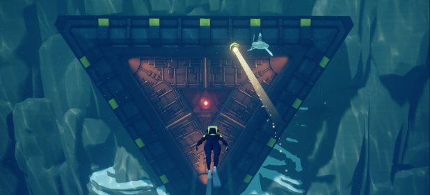 Erst danach kann man in der befreiten Region die ersten azurblauen Bildtafeln erkunden, auf denen ikonographische Abbilder des eigenen Selbst scheinbar Rituale vollziehen. Also geht es doch um eine Reise in die eigene Vergangenheit? Hat das eigene Volk unter Wasser gelebt? Kaum entdeckt man in der Ferne ein riesiges rotes Dreieck, das wie ein Auge aus der Ferne glimmt, fragt man sich: Gab es Besucher einer anderen Welt? Wurde die Idylle gestört? Schließlich entpuppt sich das Auge als metallischer Schacht, der sich wie ein Raumschiffhangar öffnet. So taucht man in den nächsten Unterwasserbereich – Abzû macht in der ersten Viertelstunde richtig neugierig.