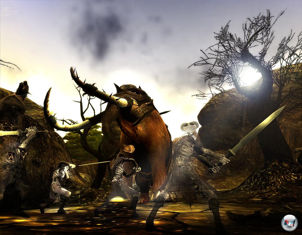 Die zu Barbaren im Allgemeinen und der Fantasy-Welt von Cimmerien im Speziellen passende Gewalt hingegen wurde adäquat eingefangen. Bei den normalen Attacken fliegen kleine Blutfontänen durch die Gegend. Und der nach einer bestimmten Formel berechnete und prozentual ausgeschüttete „Fatality“-Proc, der abhängig von der benutzten Waffe eine von insgesamt gut 50 unterschiedlichen Animationsphasen auslöst, ist nicht nur visuell immer wieder reizvoll. Denn wenn ihr dem Gegner spektakulär die Waffe in die Brust rammt, erst einmal ein paar Mal dreht, bevor ihr den Feind mit einem Kick in die Magengegend wieder von eurem „Arbeitsgerät“ entfernt oder auch mit einer Zweihandkeule wie blind auf den Schädel drescht und dabei Spritzer roter Körperflüssigkeit an den Bildschirm klatschen und die Fatality anzeigen, wird auch die Ausdauer eurer Figur rasend schnell wieder aufgefüllt – ein perfekt umgesetzter In-Game-Adrenalinschub.