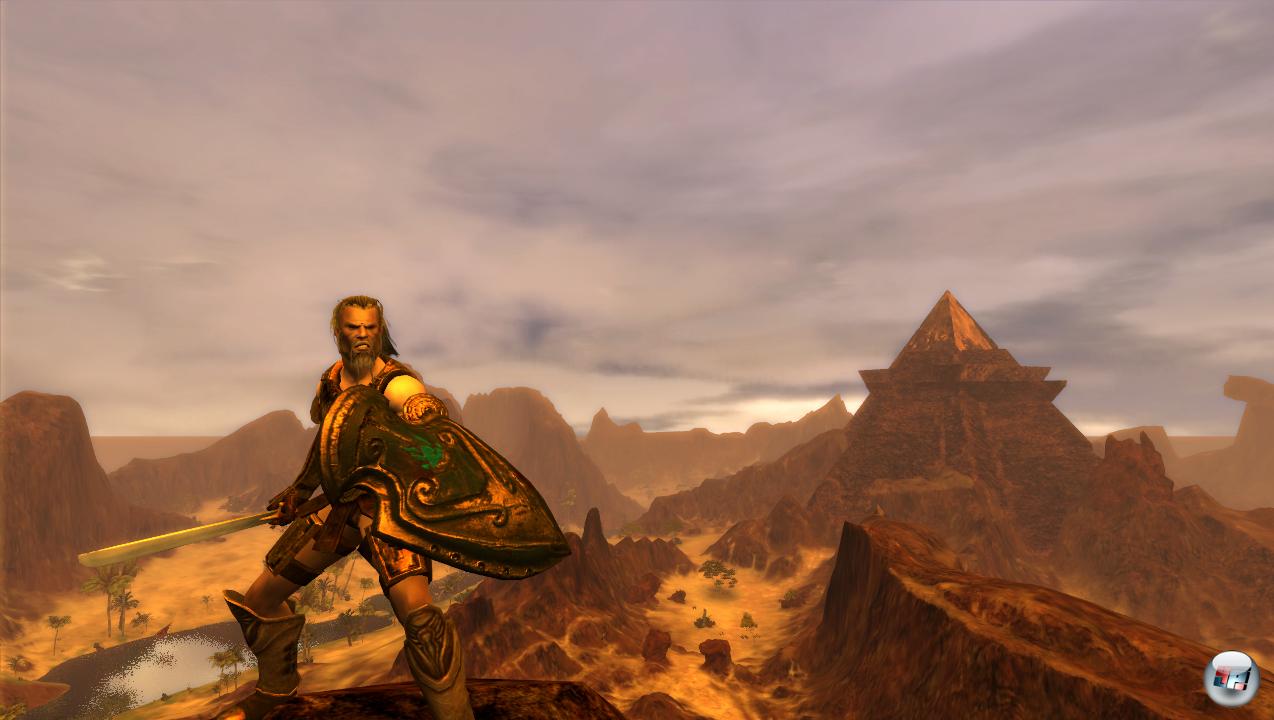 Zugegeben: Die dicht bewachsenen Wälder und Sumpflandschaften, die kargen nur von grünen Oasen durchzogenen Wüsten oder die steilen Bergschluchten, die euch in AoC den Heldenalltag versüßen, sehen auf unseren Alienwares mit QuadCore, haufenweise RAM und aktueller Grafikkartengeneration schnieke aus. Beeindruckend möchte man sagen, denn sie sind eine Gefahr für reine Offline-Rollenspiele wie Two Worlds oder Oblivion.