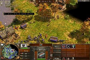 Die Steuerung ist nahezu identisch mit AoEII, so dass Veteranen auch ohne das gute Tutorial loslegen können. Ähnlich wie in AoM habt ihr bei einem Zeitalterwechsel die Wahl zwischen zwei, manchmal drei Aufstiegskarten, die euch unterschiedlich viele Rohstoffe oder vielleicht gleich zusätzliche Einheiten bringen. Neu ist, dass ihr Gebäude nicht mehr umständlich mit einem Handwerker reparieren müsst, sondern sie einfach per Iconklick in Stand setzt. Auch das Anlegen von mehreren Feldern wurde ad acta gelegt: dafür gibt es jetzt eine Windmühle inklusive Feld, auf dem bis zu zehn Bauern ernten können. Sehr hilfreich ist auch die erweiterte Drag&Drop-Funktion, die euch auf Wunsch nur Militäreinheiten auswählen lässt – so zieht man in der Hitze des Gefechts nicht mit Kühen und Beerensammlern in die Schlacht.