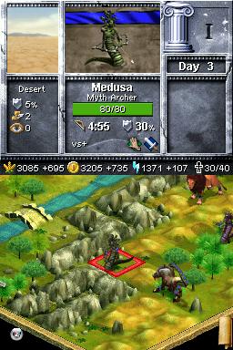 Wenn man bedenkt, dass jeder Held zudem einzigartige Fähigkeiten wie die Stärkung oder Beschleunigung seiner Truppen hat und diese über die Forschung noch weiter entwickelt werden können, dass man sowohl Relikte erobern als auch neue Zeitalter erforschen und damit seine Einheiten verbessern kann, muss man anerkennend nicken – hier wurden nahezu alle spielmechanischen Details der PC-Vorlage übernommen! Das neue rundenbasierte Spielprinzip besteht aus Bewegen, Angreifen, Bauen oder Ausbilden. Man kann Einheiten entweder per Steuerkreuz oder Stylus über die hübschen Wüsten-, Wald-, Lava- und Schneekarten bewegen und sollte dabei auch auf die Geländefelder achten, die sich auf die Effizienz auswirken: Auf einem Hügel hat man eine höhere Sichtweite und einen Kampfbonus, ebenso auf Brücken, in einem Wäldchen steigert der sich noch mal in Form eines Überraschungsbonus. Auf Straßen kann man in einem Zug weitere Strecken hinter sich bringen und man sollte landschaftliche Sackgassen zur Staffelung von Nah- und Fernkämpfern nutzen.