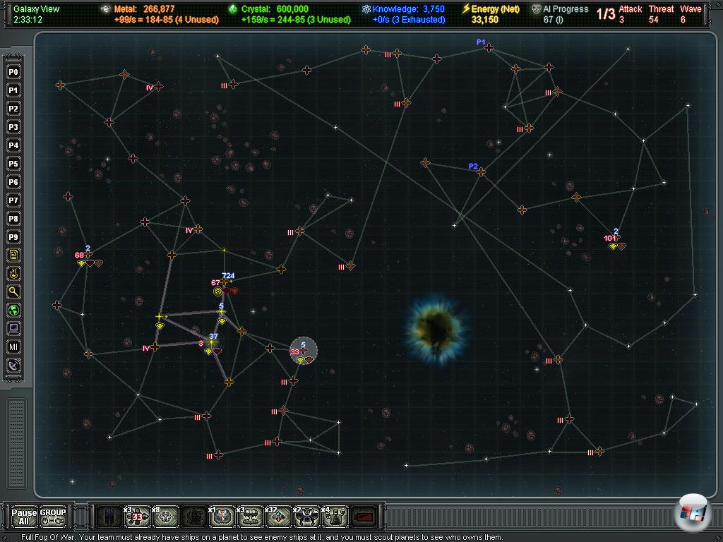 Mit der Zeit produziert ihr in den Planetensektoren dann eure Flotte bestehend aus Spähern, Jägern, Bombern, Kreuzern mit konkreten Vor- und Nachteilen (abzulesen in den langen Tooltipps) sowie zahlreiche weitere Schiffe mit Spezialfunktionen (Tarnung, Kraftfeld, Angriffskraft-Buff). Die entstehenden Flotten könnt ihr durch Wurmlöcher in Richtung anderer Sternensysteme oder zum Gegner senden. Ein cleverer Schachzug ist die Einheitenbeschränkung: So könnt ihr von einem Typ (z.B. Jäger – Mark II) nur eine festgeschriebene Anzahl kommandieren und sobald ihr diese erreicht habt, seid ihr gezwungen andere Truppen zu bauen. Pures Spammen eines Typs wird so vermieden und ihr zieht letztendlich Armeen mit verschiedenen Einheiten hoch, deren Zahl wohlmöglich in die Tausende geht.__NEWCOL__