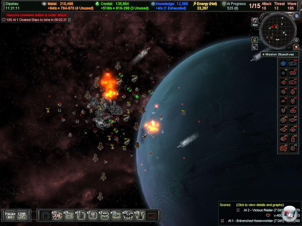 Nein, weder eine Geschichte noch eine klassische Kampagne gibt es in AI War Fleet Command. Schnöder Text im Hauptmenü verkündet, dass sich weit in der Zukunft eine mächtige Computerintelligenz gegen ihre menschlichen Schöpfer gerichtet hat und ihr als interstellarer Kommandant ums Überleben der Menschen kämpft.