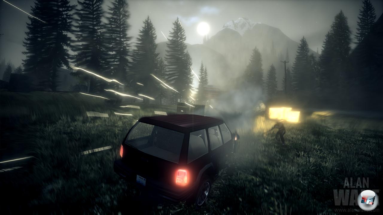 Bei Tag muss man diese Konflikte natürlich nicht befürchten. Wer nicht mit 120 Sachen durch die atemberaubende Landschaft düsen will, kann jederzeit aussteigen und überraschend weitläufige Areale zu Fuß erkunden – die phänomenale Sicht auf Gipfel und Schluchten erstreckt sich über Kilometer. Die Bergwelt sieht fantastisch aus, weil Hänge und Bäume, Felsen und Büsche wie gemalt wirken. Ich habe noch nie so eine authentische Darstellung einer waldigen Landschaft gesehen. Hier und da rollt sich zwar Gras in einiger Entfernung auf und es gibt etwas Tearing, aber technisch ist Alan Wake hinsichtlich der Texturen und Weitsicht ein Augenschmaus.