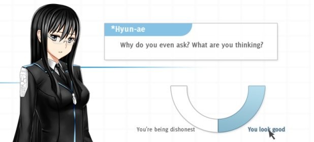 Hat man sich erfolgreich vorwärts gehackt, gelangt man von einem grauen Computerterminal auf einen strahlend weißen Bildschirm, auf der einen die AI in Form einer schwarzhaarigen Mangalady mit Rehblick begrüßt. Hier muss man keinen Text à la „Bediene Computer mit Händen“ eingeben und kann nahezu alles über Klicks bedienen. Allerdings darf man nicht gezielt in einem Archiv recherchieren, sondern muss sich Stück für Stück vorwärts wühlen, bis sich aus zahlreichen Fragmenten ein Bild ergibt. Die AI hat eine Persönlichkeit und scheint erfreut über den Kontakt nach all den Jahren, stellt Fragen und