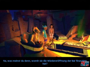 wieder durch den Palast schleicht und unter der Sonne der nordafrikanischen Wüste brutzelt. Eines fehlt, denn zum Nil dürft ihr nicht runter, nachdem Assil letztes Mal schlechte Erfahrungen mit dem nassen Element machte. Neue Orte sind die Bar mit der Mumie, die von der tanzenden Palastwache bewacht wird, der Friedhof, wo die Halsabschneider ihr Unwesen planen, oder der Steinbruch, wo die Sklaven im gleißenden Licht schuften. Die Zwischensequenzen haben wieder Filmtouch, auch weil sie wechselnde Perspektiven bieten.Die Figuren sind optisch identisch mit denen des Vorgängers, was grundsätzlich in Ordnung ist, da die 3D-Grafik qualitativ überzeugte. Aber hier hätte die Macher durchaus noch mehr feilen können, denn die Figuren sind immer noch nicht optimal in die Umgebung eingebunden, was dazu führt, dass sie seltsame Dinge tun: Thara steigt z.B. umständlich über einen Sack, um auf die andere Seite zu kommen. Bisweilen fehlen die Figuren auch mal. Manches, was so am Straßenrand herumsteht, sieht schlicht grob oder eckig aus.