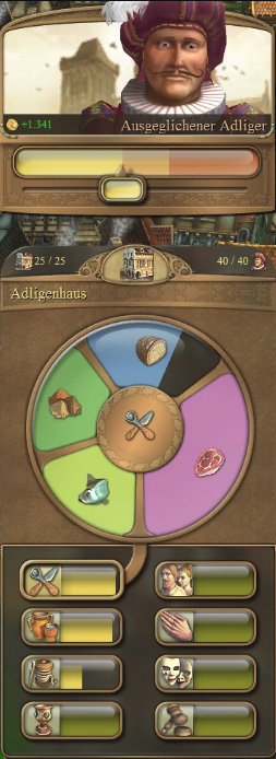 | Die Bedürfniskategorie „Nahrung“ ist für Adelige so gestaffelt, dass sie mit Fisch, Gewürzen, Brot und Fleisch versorgt werden müssen. Im Augenblick schwächelt die Versorgung mit Brot. |