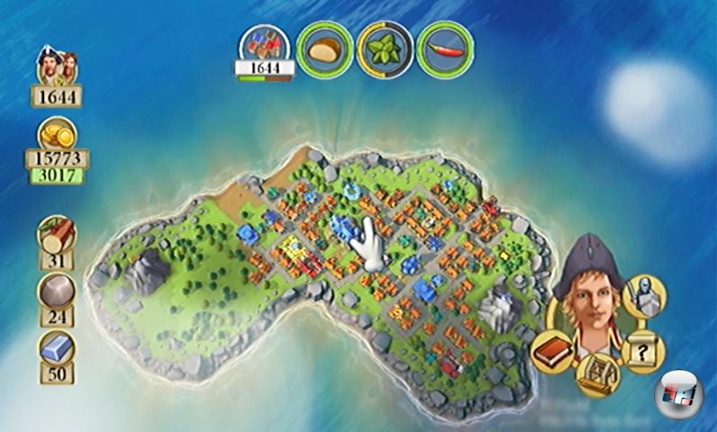 Über das in malerischen Blautönen schimmernde Meer prescht mein Entdeckerschiff. Mit gedrückter A-Taste und der Fernbedienung in Richtung Zielpunkt huscht meine Nussschale über den Ozean, bis eine Insel in Sicht ist. Sie ist sogar sehr fruchtbar für Getreide und Hanf? Toll, da baue ich sofort mein Kontor! Danach folgt die typische annologische Baureihe aus Holzfäller, Fischer, Wohnhäuser und Kapelle. Diese Gebäude werden ganz ohne Nunchuk- oder Remotegefuchtel im Comicstil auf die Karte getackert, wobei sich die Bauwerke aus einem übersichtlichen, teilweise mehrstufigen