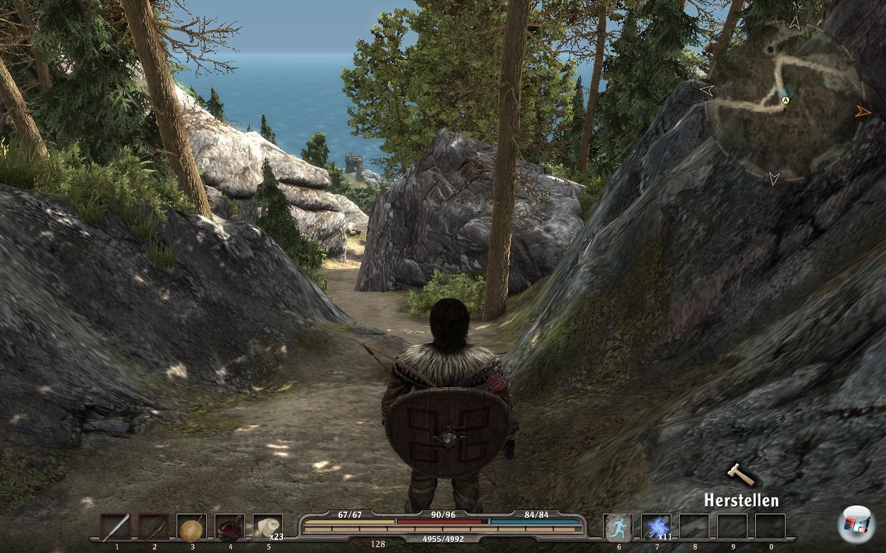 Im grafischen Bereich ist Arcania aber deshalb gut, weil die Engine weite Einblicke in das Land inklusive ansehnlich rauschender Brandung ernöglicht – gerade das wogende Meer, das auf der Xbox 360 allerdings nur wie blaue Plastikfolie aussieht, sorgt auf dem PC fast für Urlaubsaussichten. Hinzu kommen plötzliche Wetterwechsel, die sich über graue Wolken ankündigen, sowie je nach Licht ein anderer Charakter in der weiten Hügellandschaft. Ich betone das alles bewusst, denn der äußere Rahmen kann sich sehen lassen und durchaus Lust auf die Erkundung machen. Schade nur, dass man dieses Fundament nicht nutzt, um ein episches Abenteuer für anspruchsvolle Rollenspieler zu inszenieren – man nutzt sie, um sich dem anspruchslosen Mainstream anzubiedern.