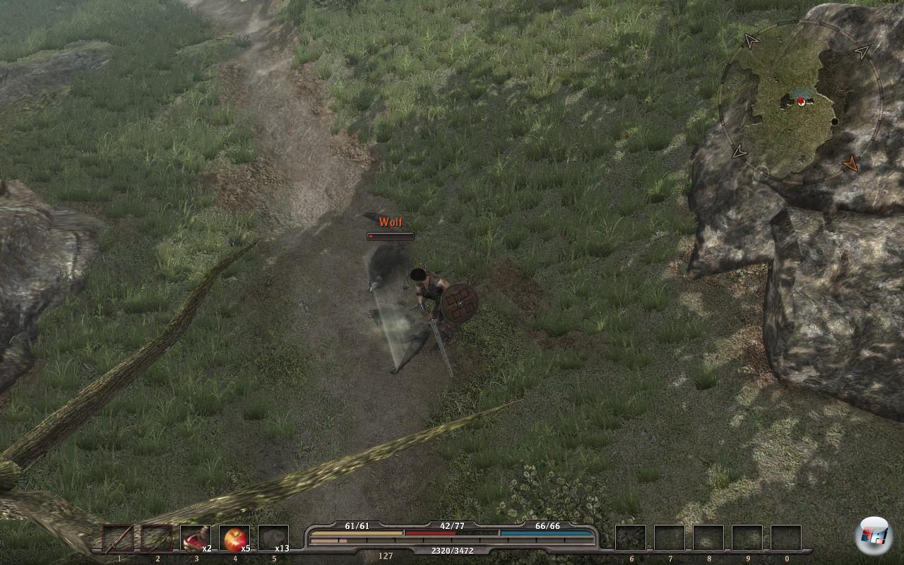 Was außerdem nervt: Sobald man in die Blockposition geht, kann man seine Haltung nicht mehr ausrichten. Man kann auch keinen Feind fixieren, um die Sicht auf ihn zu konzentrieren, so dass es teilweise zu hektischen Richtungswechseln kommt. Auch Kleinigkeiten stören das chaotische Mausklickmashing: Sobald ein schwerer Schlag den eigenen Schild trifft, zerbirst er nicht etwa, sondern es gibt einfach ein paar Blutspritzer dahinter – Waffen und Rüstungen nutzen sich nicht ab, bleiben immer so neu wie am Tag der ersten Beute. Und wer seine Angriffe mit einem Bogen vorbereitet, kann Lager noch einfacher ausheben: Einen von vier Goblins anschießen, der dann trotz Sichtkontakt alleine (!) auf einen zu joggt, dann die Sehne immer wieder beim gleichzeitigen Zurücklaufen voll ausziehen und den Pfeil losjagen – zwei, drei reichen für die nächste Leiche.