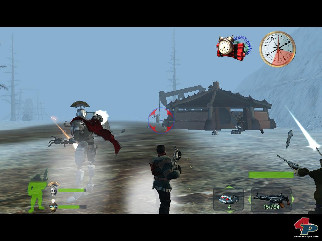Waffen wie diese findet ihr an den in jedem Level herumstehenden Pubs, in denen auch automatisch gespeichert wird – natürlich dürft ihr auch jederzeit selbst sichern. Meist rennt ihr im Team durch die Eiswüsten, Wälder oder Schlossgegenden, wobei ihr allerdings immer nur Rom kontrolliert – eure Kumpels dackeln brav hinter euch her, schießen selbständig auf Feinde und heilen sich auch mehr oder weniger zuverlässig, wenn sie an einem Medipack vorbeilaufen.