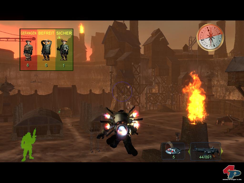 Spürnasen sollten die Augen nach versteckten Karten offen halten, die mit der Zeit immer neue Features freischalten – unter anderem könnt ihr euch so neue Schwierigkeitsgrade oder Cheats verdienen. Sonst gibt es nicht viel zu entdecken; neben Munition und Heilpäckchen liegen nur ein Raketenwerfer-Upgrade und ein große Sprünge ermöglichendes Jump-Pack in der Gegend herum. Ihr könnt auch diverse Geschütze benutzen, um der Gegnermassen leichter Herr zu werden; u.a. stürmen verschiedene »Grunzer«, Wachen, Trolle und die korbflechtenden Mönche auf euch ein. Gelegentlich bekommt ihr es auch mit extra-dicken Zwischengegnern oder Feinde abwerfenden Zeppelinen zu tun.