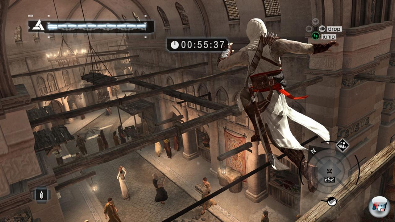 Das Problem mit Assassin's Creed ist, dass das Spiel sich von vorne bis hinten selbst zelebriert. Überall versucht es besonders intelligent zu wirken und neue Maßstäbe zu setzen. Es wurde schon dazu konzipiert, besser zu sein als die Anderen. Der Schuss ist offenbar nach hinten losgegangen, da AC bei näherer Betrachtung einfach nur albern und aufgesetzt wirkt. Und das Symbol hinter dem Titelschriftzug erinnert auch unverschämt an das Emblem der ICA aus der HITMAN-Serie, dass in genau der gleichen Form hinter dem Schriftzug prangt. Und Altair kann keinesfalls auf das hohe Niveau eines Mr. 47 geprügelt werden.