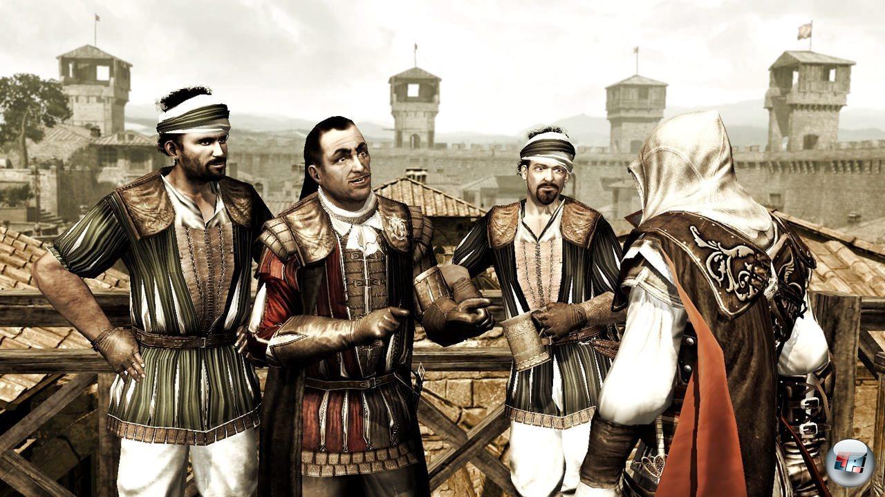 Einen großen Anteil an dem Charakter und der Qualität der Städte hat natürlich auch die Akustik. Und die ist ebenfalls vom Allerfeinsten: Die Lokalisierung ist inhaltlich und technisch erstklassig, die Sprecher gut ausgewählt und auch wenn im Englischen die kleine, aber feine Anspielung auf einen anderen großen Videospielhelden witziger ist (Ezios Onkel stellt sich mit „It’sa me: Mario!“ vor) als in der deutschen Variante, muss man in diesem Bereich Mankos mit der Lupe suchen. Dazu