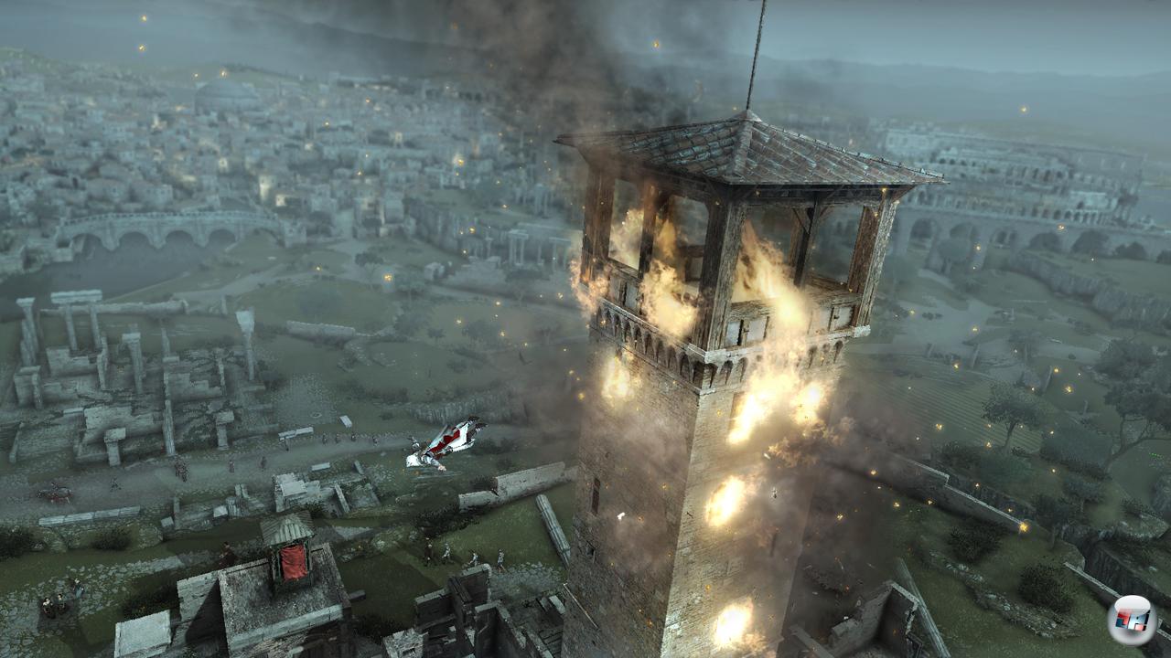 Um die Macht über das Stadtviertel und damit die Möglichkeit zu bekommen, Gebäude zu kaufen, muss der Turm abgefackelt werden. Doch bevor man sich an der Fassade nach oben hangelt, muss erst der jeweilige Hauptmann ausgeschaltet werden. Und das kann sich mitunter als forderndes Unterfangen herausstellen. Mal patrouilliert der Chef der Garde tief in den Mauern seiner Mini-Festung, mal ist er offen unterwegs, gibt aber beim geringsten Anzeichen von Gefahr Fersengeld und lässt sich erst am nächsten Tag wieder blicken – Abwechslung ist garantiert. Dass diese Borgia-Gebiete teilweise auch auf dem Weg zu Missionszielen der Hauptgeschichte liegen und das Vorwärtskommen erschweren, macht diese Nebenmissionen nur noch reizvoller.