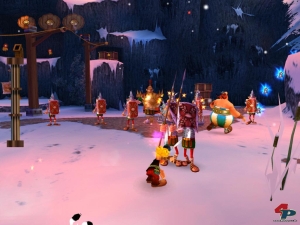 Die Optik des Games ist auf den ersten Blick unspektakulär, besonders vermisst man Cel-Shading, das der Action den letzten Comic-Schliff verpasst hätte. Nach einer Weile findet man aber Gefallen an den netten Animationen, den ansehnlichen Effekten und vor allem der rasenden Geschwindigkeit, die dem Vermöbeln der Gegner-Horden keine Schwierigkeiten macht. Akustisch bleiben vor allem die herrlich panischen Schreie getroffener Gegner in Erinnerung, die euch in Dolby Surround um die Ohren fliegen. Auch die ungewöhnlich treibende Musik mag auf den ersten Ton nicht so recht in das gallische Ambiente passen, unterstützt das Spielprinzip aber mit flotten Drum-n-Bass-Rhythmen. Im krassen Gegensatz dazu besticht die deutsche Sprachausgabe durch sehr schlafmützige Stimmen, besonders vom brummeligen Obelix erwartet man kein derart hohes Gefiepse