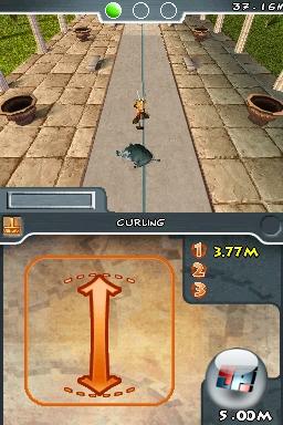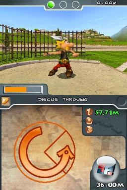 Gut, dass ich meinen DS ohnehin demnächst zur Reparatur einschicke. Im Point & Click-Adventure Runaway ließen sich die filigranen Dialogzeilen nicht mehr genau genug antippen. Doch für mein grobmotorisches Gerubbel und Gehacke reicht die Präzision des berührungssensitiven Bildschirms noch aus. Auch euer Touchscreen wird auf eine harte Probe gestellt, wenn ihr euch das olympische Abenteuer der ewig rebellierenden Gallier zulegt. In einer riesigen Zahl an Wettkämpfen traktiert ihr seine Oberfläche mit dem Stylus: von oben nach unten, von links nach rechts, im Kreis oder sogar in wechselnde Richtungen. Mal ist ein guter Rhytmus gefragt, ein anderes mal pure Geschwindigkeit.![]()