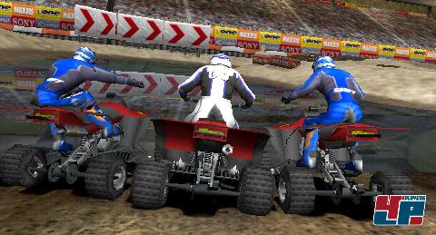 Ich erinnere mich: Unsere Testfassung zu ATV Offroad Fury 4 war damals von massiven Fehlern bei der Kollisionsabfrage geplagt, die so etwas wie Fahrspaß gar nicht erst aufkommen ließen. Touchierte man nur leicht eine Bande, wurde man automatisch auf die Strecke zurück gesetzt und verlor dabei jedes Mal wertvolle Sekunden. Die gute Nachricht: Dieses Problem gibt es auf der PSP nicht (mehr) – nur wenn ihr zu weit von der Strecke abkommt, setzt der Countdown ein, der mit einer Zurücksetzung droht (und diese gegebenenfalls auch durchzieht). Zwar hat man sich bei der eintönigen Farbpalette schnell an den über 60 Kursen satt gesehen, doch dürft ihr euch auf durchweg flüssige Rennen freuen, die nur vereinzelt von Pop-Ups bzw. Fade-Ins geplagt werden. Zudem stehen euch mit mehreren Innen- und Außenansichten (sowie überflüssigen Schrägansichten) viele Perspektiven zur Verfügung, bei denen jeder seine ideale Einstellung finden dürfte. Begleitet werden eure Fahrten genretypisch von durchweg rockigen Klängen. Ist Geschmackssache, aber ich drücke gerne zu Titeln wie Through the Fire & Flames von Dragon Force auf die Tube, das neben vielen weiteren (meist unbekannten) Tracks auf die UMD gebannt wurde. Reichen euch die mitgelieferten Pisten nicht aus, dürft ihr euch wie auf der PS2 selbst Nachschub im Streckeneditor basteln. Habt ihr noch ein USB-Kabel und ATV Offroad Fury 4 zur Hand, dürft ihr sogar Daten wie die selbst erstellten Pisten sowie Fahrzeuge zwischen PS2 und Handheld austauschen. Auf einen Onlinemodus müsst ihr dagegen auch auf der PSP verzichten. Stattdessen stehen lediglich Duelle für bis zu vier Spieler über WiFi an, bei denen ihr aber zumindest die Wahl zwischen Einzelrennen, Freestyle-Events und sogar dem Absolvieren ganzer Meisterschaften habt.