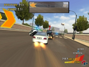 Schneller wird es nur mit dem regenerierbaren Turbo, der eurer Mühle kurzzeitig Chili in den Auspuff jagt, und damit wenigstens etwas Dynamik entfesselt. Theoretisch existiert auch ein Schadensmodell – jedenfalls bewirken Rempler oder das nähere Kennenlernen einer soliden Wand das Auffüllen einer entsprechenden Anzeige. Aber weder wirkt sich das optisch noch spielerisch auf euer Fahren aus; außerdem könnt ihr die Karre im Flug durch das Aufsammeln entsprechender Symbole reparieren. Bleiben noch die hohlen Gegner, die kein Überholen, sondern nur Rammen kennen, sowie die Polizei, die nur gelegentlich Lust zur Verfolgung hat, und sich lieber einen Spaß daraus macht, mehrere Runden lang vor euch her zu fahren – wohl um den störenden Zivilverkehr aus der Bahn zu scheuchen.