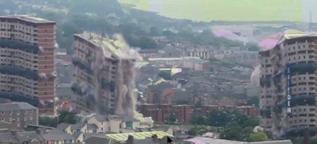 In Zeitlupe bohren sich einstürzende Hochhäuser in dicke Staubwolken, die Sprengungen werden mit einfarbigen Grafiken zusammengeschnitten. Die Musik serviert eine melancholische Stimme zu sanften Klicks – ein ganz starker Eindruck! Leider hat dieser bildgewaltige Trailer sehr wenig mit dem Spiel zu tun.
