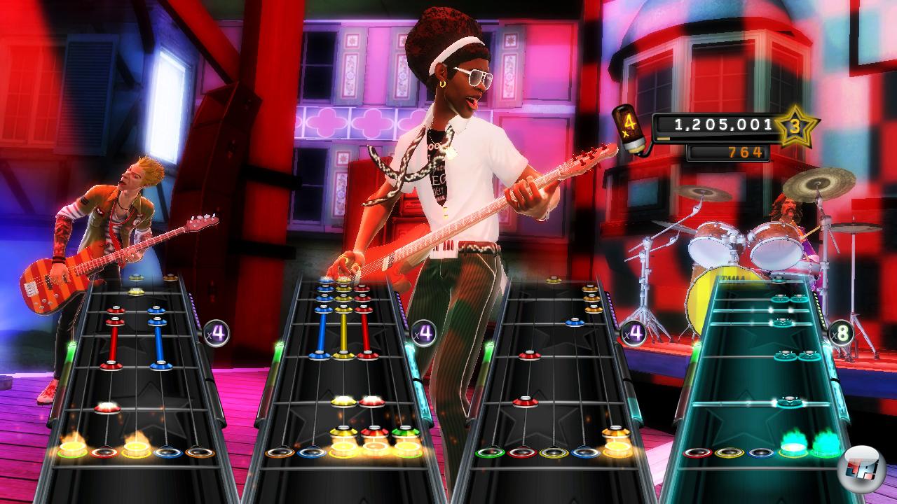 Das mit World Tour <a class="DYNLINK" onmouseover="DynToolTipp_Show('Klicken für Gameinfos‚)“ onmouseout=“DynToolTipp_Hide(); “ href=“javascript:DynCont_Display(‚Gamefinder‘,’runmod.php?sid=%7BSID%7D&LAYOUT=dyncont_gf&spielid=16053′)“> eingeführte Slidepad war von Anfang an eine bessere Idee als die tatsächliche Umsetzung – kein Wunder, dass es in Band Hero nicht explizit genutzt wird. Dafür wird von der mit dem Slidepad einher gebrachten Mode, mit dem Gitarren-Controller auch andere Instrumente als die Klampfe zu spielen, exzessiv Gebrauch gemacht. Okay, das kannte man schon im allerersten Guitar Hero <a class="DYNLINK" onmouseover="DynToolTipp_Show('Klicken für Gameinfos‚)“ onmouseout=“DynToolTipp_Hide(); “ href=“javascript:DynCont_Display(‚Gamefinder‘,’runmod.php?sid=%7BSID%7D&LAYOUT=dyncont_gf&spielid=8631′)“> (bei »Killer Queen« von Queen spielte man kurz ein Klavier), aber mittlerweile wird’s übertrieben: Mit