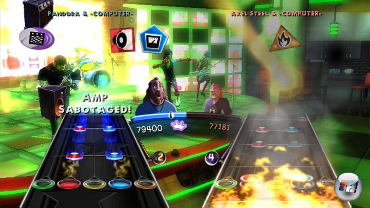 oder Verstärker in Brand gesetzt; für den Spieler auf der Bühne äußert sich das so wie bei den Boss Battles in Guitar Hero 3. Hat man erfolgreich alles sabotiert, ist man aber noch lange nicht fertig – denn der Gegner macht mit dem eigenen Rocker ja das gleiche! Also rennt man ständig von Bühne zu Bühne, sabotiert hier und repariert da, achtet immer darauf, möglichst viel Schaden anzurichten und hört auf die Rufe des Kollegen, wenn er vor lauter Zerstörung mal wieder gar nix sieht. Ein Riesenspaß!